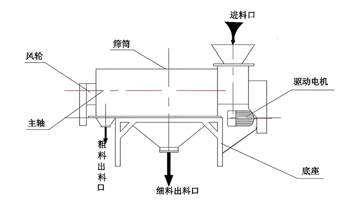 通用的氣流篩類型以氣流輸送和離心篩分協(xié)同工作,以下介紹常用的臥式氣流篩的工作原理:篩分腔水平放置,氣流發(fā)生裝置連其側面。工作時,高壓風機產(chǎn)生水平氣流進入篩分腔,物料從腔一端進料口進入,在氣流推動下水平運動,同時經(jīng)腔底水平篩網(wǎng)篩選。細顆粒穿篩網(wǎng)后從下方細料出口排出,粗顆粒繼續(xù)水平運動,從腔另一端粗料出口排出。其水平結構延長物料停留時間,對流動性差或易團聚的物料篩分更充分,且水平氣流更強沖刷篩網(wǎng),降低堵塞風險。